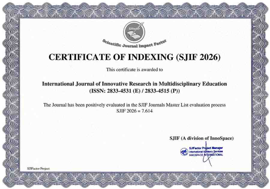 International Journal of Innovative Research in Multidisciplinary Education is a leading international journal for publication of new ideas.The primary goal of the editors is to maintain high quality of publications on theoretical developments and practical applications. Original research papers, state-of-the-art reviews, and high quality technical notes are invited for publications. Authors should note that only original and previously unpublished manuscripts will be considered. The articles that are sent for reviews will have names of the authors deleted with a view towards enhancing the objectivity and fairness of the review process. Time to time, the Journal will publish review articles and bring out special issues on a specific field. Authors are encouraged to contact the Editors if they would like to submit a review article or bring out a special issue of the Journal. Submission of a manuscript is interpreted as a statement of certification that no part of the manuscript is copyrighted by any other publication nor is under review by any other formal publication. It is the primary responsibility of the author to obtain proper permission for the use of any copyrighted materials in the manuscript, prior to the submission of the manuscript to IJIRME.